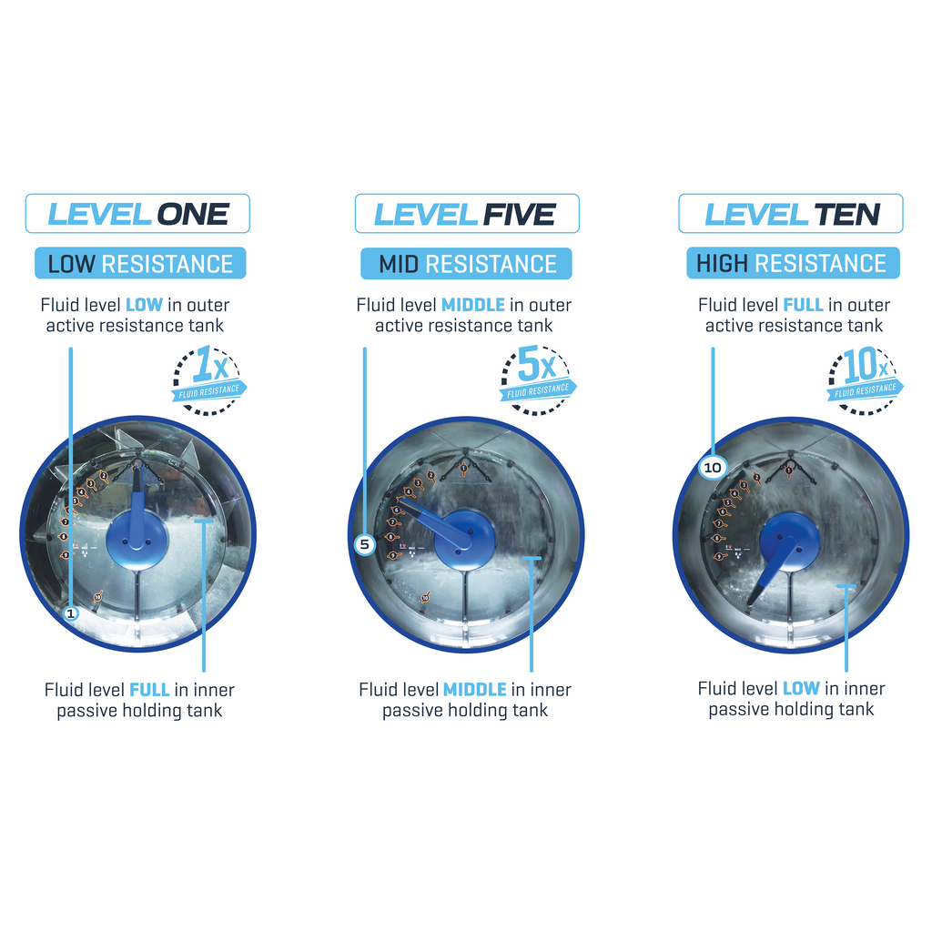 The E750 resistance is set via our 10x Adjustable Fluid Resistance patented Twin Tank system and the RPM is driven by you. The E750 will remain silky smooth and consistent at very low RPM and is capable of handling the ballistic speeds of a HIIT workout. This wide variation in load and speed capabilities allows you to train effectively to any workout program.